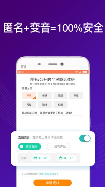 3、在线就可以免费电话连线,带来了完全免费的真人连线倾听。