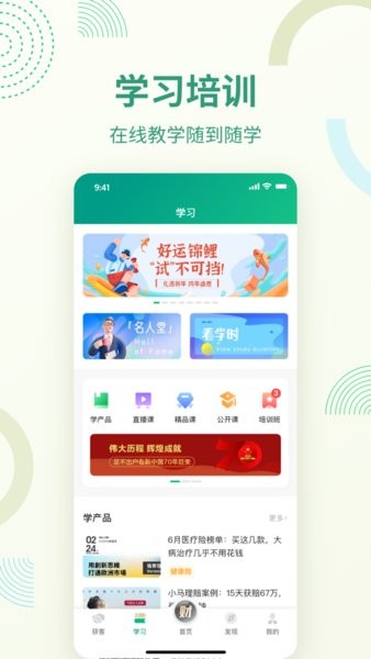 app的功能模块包括获客资源、个人管理、展业工具、学习培训等,特色亮点有销售微门店、客户评价体系、内容精准推荐和本地生活服务等。软件还支持保险交易商城、专业培训课程以及与800万同行互动的社区功能,极大提升了销售人员的工作效率和客户服务质量。