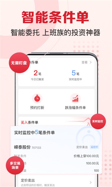 全面的交易功能,覆盖普通交易、融资融券、港股通、全国股转、场内外基金、债券逆回购、银行理财/OTC等。