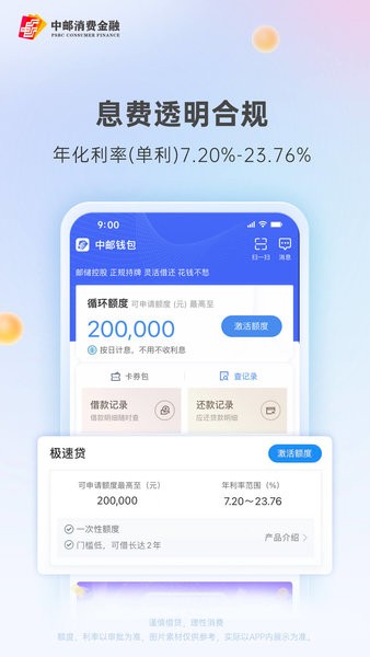 中邮钱包软件中是中邮消费金融有限公司官方推出的移动金融平台,提供现金贷款以及生活服务。