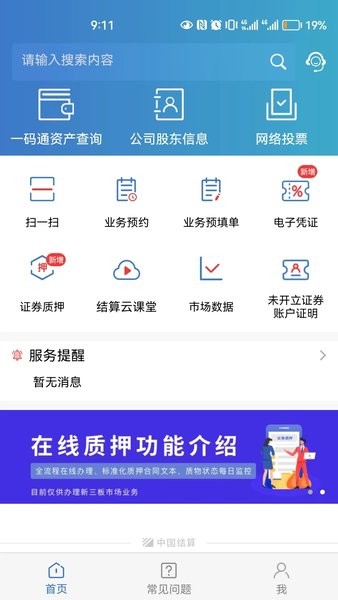 中国结算APP为中国证券登记结算有限责任公司(简称“中国结算”)官方移动服务平台,为投资者和发行人提供服务,涵盖一码通资产、公司股东信息、证券查询、网络投票、证券质押、业务预约、业务预填单、市场数据查询、智能客服等功能。