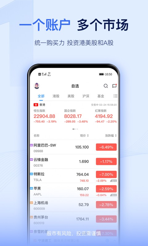 一个综合账户,可交易港股、美股、A股通、基金