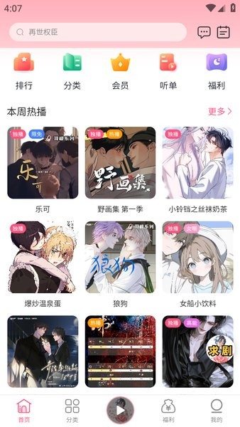 花间fm免费广播剧在线听app最新版本中可以找到大量的广播剧和有声剧,软件划分了有声书、原耽、纯爱、虐恋等多种类型,方便大家选择;同时每周热榜为大家推荐本周最多人听的广播剧,这样能发现更多好听的剧集。