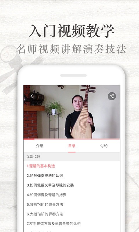 琵琶学习从入门到精通,琵琶考级辅导课程。“琵琶行”APP拥有琵琶演奏考级大量的曲目内容,让您更进一步。