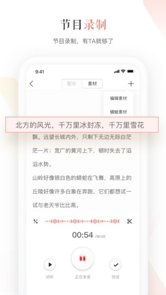 录制节目,快捷发布,还可复制粘贴文稿和节目简介,随时随地制作节目。
