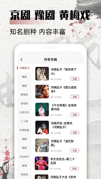 戏曲屋手机版是一款功能全面的戏曲播放类软件,,提供京剧、评剧、晋剧、豫剧、越剧、秦腔、黄梅戏、二人转、梆子等热点交流,名家坐场解析指引与示范,专为广阔戏迷喜好者打造的应用。