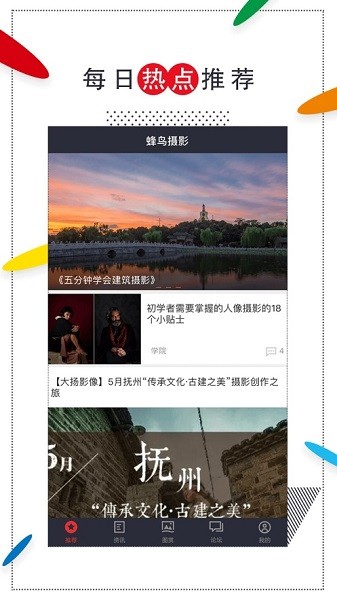 蜂鸟摄影软件是用来给专业的摄影人士和拍照摄影爱好者们的一款手机app,在这里用户们能够找到超多与拍照摄影有关的资讯进行查看,还能够找到非常多的有关摄像头的信息和各种摄影拍照作品等等能够在这里看到,超级的方便好用。