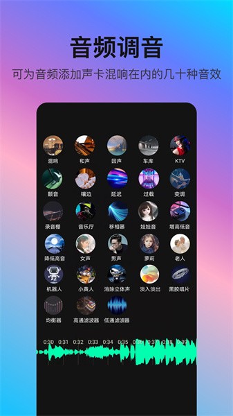 音频剪辑转换,降噪,取伴奏,和声混响黑胶音效,边听边录,合成,拼接,音速音量调整,音频编辑,视频取音频等音乐修饰的应用,助你创作自己喜欢的音频。
