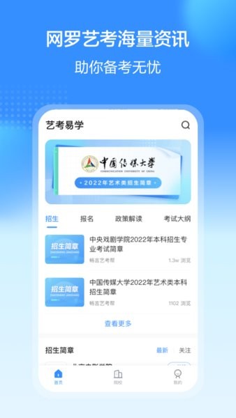 艺考易学手机版是提供艺考学习的备考软件,网罗了海量艺考资讯,同步更新推送,还提供各种艺考院校招生需求,方便大家了解,轻松备考!