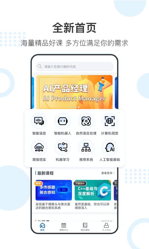 深蓝学院app软件最新版包含的课程知识非常之广泛,以人工智能为主,智能机器人、语音、计算机视觉等一应俱全,含有公开课和大课,有超多免费课程可以学习,业内大咖倾情讲解,能够查看详细的历史课程记录,课程进度一目了然。