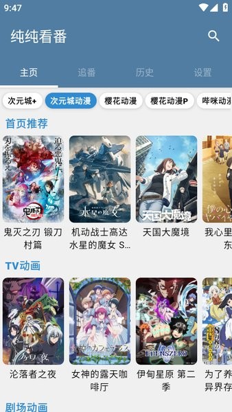 纯纯看番软件是一款内置多个动漫源的追番神器!app里面可以切换到omofun、次元城动漫、樱花动漫、哔咪动漫和age动漫,每个动漫平台的资源都很多,并且都是免费看。还有追番历史和观看记录,每天都能看新番。