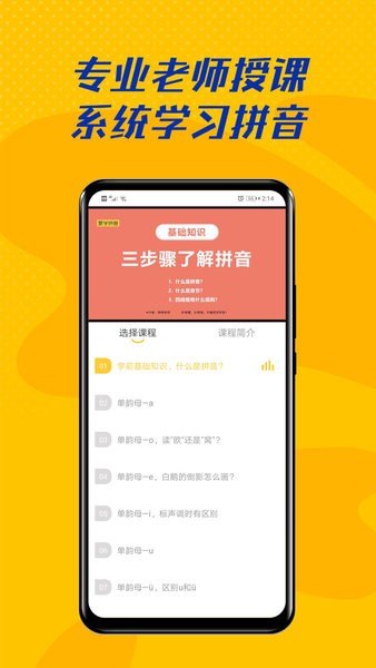 爱学拼音app最新版有专业的老师传授简单的拼音知识,以图文并茂的方式来让孩子学习汉字的标准发音,囊括了小学阶段各个年级需要掌握的古诗资源,与课本知识同步,帮助孩子自主学习,打好拼音基础,让以后学习更顺畅!
