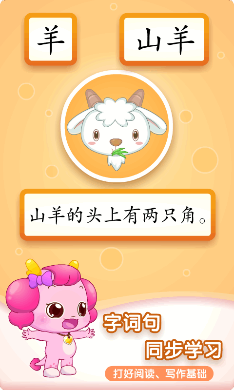 - 辨认字形、跟读字音、笔画书写、趣味练习,每个字都分多步进行教学,让孩子全面掌握汉字的形、音、义。