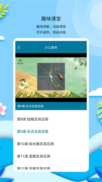 新汉字宫同步小学1-6年级1册语文生字表,涵盖小学语文2500个生字;每个字配有笔顺、粉笔、钢笔、毛笔等示范书写;并且拓展了拼音、部首、组词,视频超过10000个。 书法课堂为每周一讲,分12个学期268个知识点。授课老师根据需要可灵活选择(如3、4年级学习毛笔基本功,5年级学习欧体笔法)。 在满足教育部《中小学书法教育指导纲要》要求的基础上加入1-6年级硬笔课,科学、合理、系统安排课程,使学生逐步掌握基本技法,适用于每周一节的书法课堂或书法培优课等。