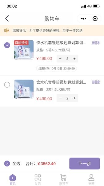 4、一次购物,利用这里的购物车能够一次找全、买全所需要的饮用水等;