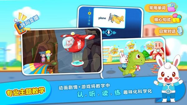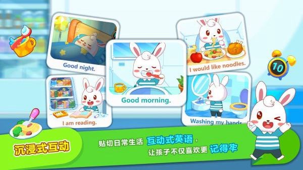 将英语融入到日常生活中。模拟兔小贝的一天,将问候、吃饭、睡觉、洗漱、上厕所、读书等家庭场景形象化,让宝贝能更直观地畅玩学习。