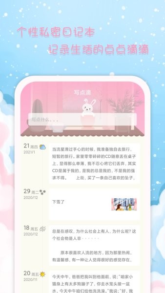 4、写点滴:记录生活点滴,来写一写今天的心情吧,每天记录一点,让点滴成为回忆。