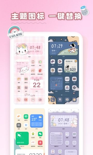 App的操作也很简单,页面清爽不复杂,连我这种不太懂手机设置的人也能轻松上手。尤其是换图标功能,有上百种样式可以选择,感觉每个小组件都能成为你手机的“小贴纸”,让桌面变得生动有趣。