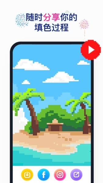 6.完成的像素作品会自动保存,支持将完成的草莓视频像素画一键分享到抖音、快手、微信等平台,让大家都可以欣赏你的画画过程~