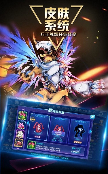 在战斗界面中,《数码宝贝大冒险》采用当下最流行的界面布局,简单易懂、清晰明了,手指轻戳,即可随意发动数码宝贝的华丽大招,连击快打!分分钟让酷炫的技能特效“震碎”你的全屏,让敌人感受到绝望!