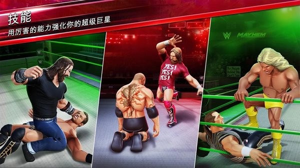 WWE Mayhem以美国职业摔跤位背景的体育竞技游戏,挑选您的角色参加训练,要想战胜强大的敌人我们必须熟悉每个角色的操作,在您准备充分后就要发起对敌人的战斗,利用角色的特殊技能击败对手,当您打败了很多对手后就能获取丰厚的奖励,你有足够金币升级您的摔跤手,这样就能帮您轻松的战胜强大的敌人了。