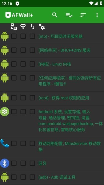 afwall+app中文版「Android防火墙+」是一个功能强大的 iptables Linux 防火墙的前端应用程序。给您的 app 带来系统级的保护(仅限捐赠版),而且通过它您可以设置允许哪些应用程序访问您的数据网络(2G / 3G和/或Wi-Fi以及漫游时)。您还可以控制LAN内或通过*连接时的流量。该应用需要root权限。