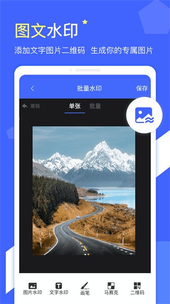 1.批量水印:支持多张图片批量添加水印。同时支持图片,文字等多种水印,更能有画笔,马赛克等多种工具,助你拥有自己的个性水印。