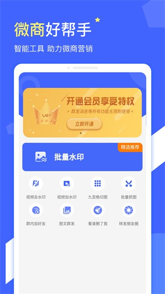 微商水印是针对微商朋友打造的微商助手工具。集合了九宫格切图,批量水印,图文水印,群发等多种微商工具。是每个微商朋友的必备软件。
