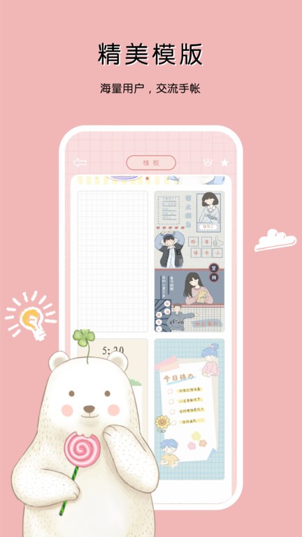 一本手帐最新版汇集了海量热门手账模板可供用户免费使用,软件提供各种可爱的贴纸和字体大大的美化的界面设计。软萌的软件界面,清新的色彩搭配,能够让用户在记录的同时得到很好的放松。软萌憨实的小熊陪你一起玩转一本手帐,希望带大家温暖、正能量!