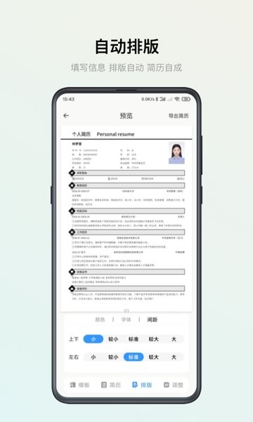 任意模板您都可以进行排版调整,一键生成简洁大方的个人简历。