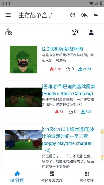 2023生存战争盒子最新版手机版简称sc盒子,软件内置了一个sc中文社区,同时还提供了各种游戏版本、生存战争mod模组大全、地图、材质、皮肤等;里面还有很多生存战争联机服务器和帖子,这些都可以帮助玩家更好的进行游戏。