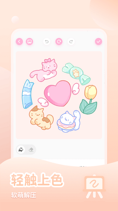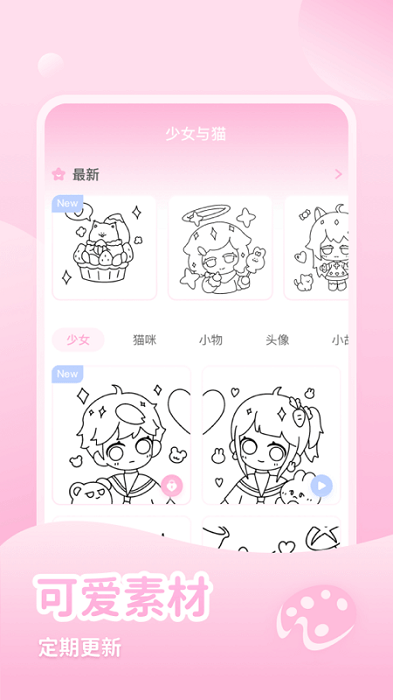 少女与猫最新版画风超级可爱的涂色手游,游戏内提供了多个模板,通过简单的点触即可完成上色,就算是新手也能轻松创作出一幅完整的图画,游戏玩法多样且乐趣十足,填色完成后还能将其分享到其它平台上。