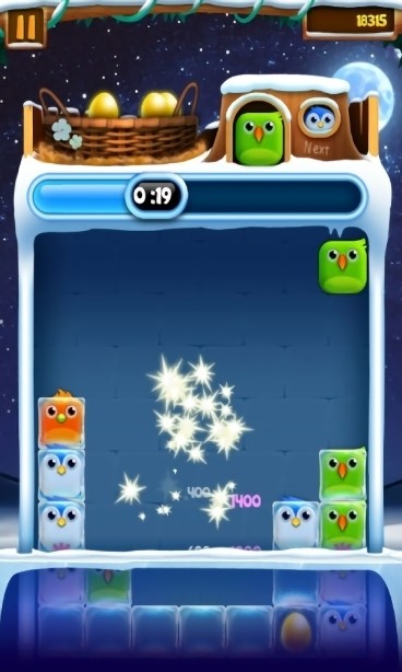 一次聚集4只同色小鸟 奖励一只发光鸟,当发光鸟被消除时可以使其周围紧挨的鸟或冰块进行一次消除。