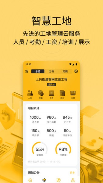 先进的工地管理云服务,人员/考勤/工资/培训/展示。