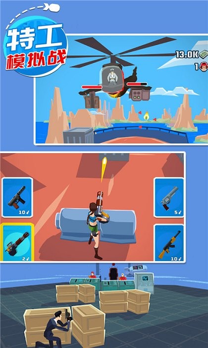 《特工模拟战》是一款以射击为主要玩法的特工手游,采用io沙盒画风,玩家化身特工,击败恶棍,守护人类安危。游戏画面流畅,配乐时髦,带有一种经典间谍电影的氛围。你可以在沙漠、货船甲板、铁路站台等场景中穿梭,体验紧张刺激的飞车追逐和船只追逐,与全副武装的头目对战。