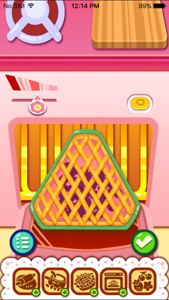 3、制作馅饼的第一步是选择馅饼的形状,通过点击左右方向键选择自己喜欢的形状。第二步是选择什么类型水鬼的馅,我选的是草莓味的,全部倒到馅饼上,点击右下方的“√”进入下一步。第三步是将弄好的馅饼放入烤箱进行烘烤,先等待一会儿。