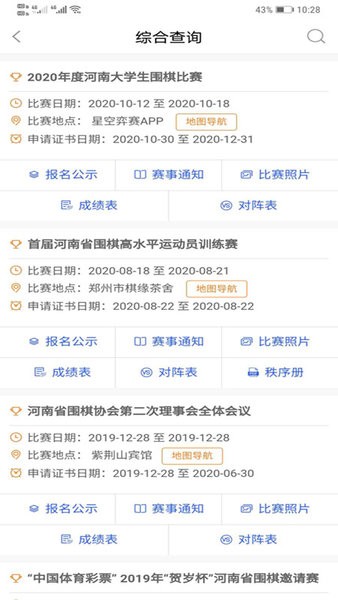 3、点击综合查询,查看各个赛事的报名信息和赛事通知内容,了解成绩表和对阵表