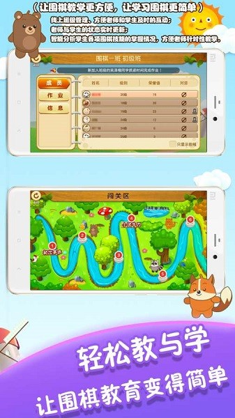 线上班级管理、方便老师和学生及时的互动;老师与学生的状态实时更新;智能分析学生各项围棋技能的掌握情况,方便老师针对性教学。