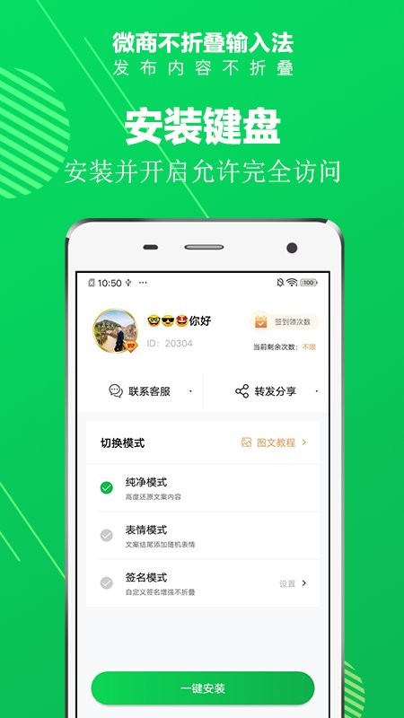 微商不折叠输入法app最新版是非常具有趣味性的输入法,可以让文字完整的展示,不被折叠,可以在不折叠输入法和手机的自带输入法之间进行切换,可以自动输入也可以复制文案,含有表情、签名以及纯净模式,可以自由切换。