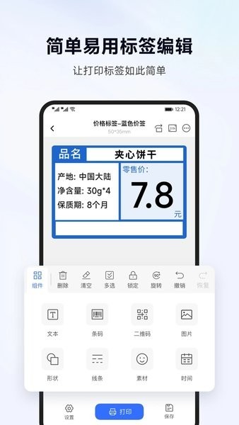 文本、条码/二维码、图片、形状、线条、素材符号、时间等多样组件一应俱全。