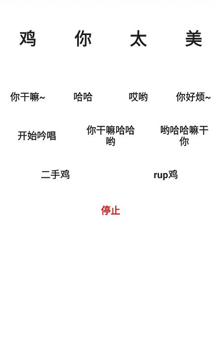 鸡乐盒1.0无广告为初始版本,页面十分简单,但主要的那几句经典坤坤语录都已收录在软件中,你只需点击它们即可发出对应的声音,在重新组合完成后点击停止即可,操作起来十分简单,喜欢鸡乐盒的朋友不要错过了。