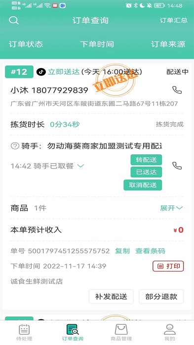 -- 订单管理:随时随地接单,处理催单,操作退单。