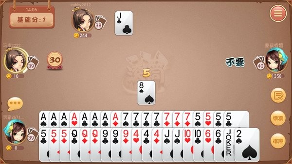 游戏中可出单牌、对子、连对、三张、连三张、五十K、同花顺、炸弹、四大天王,