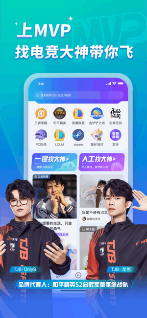 mvp电竞大神app是为电竞游戏爱好者提供的游戏娱乐平台,有明星战队入驻,一起默契上分,众多大神聚集,轻松寻找默契队友,大神带你飞,还有网红大神直播,带粉开黑,超多大神高玩,随时分享动态,大家一起玩电竞。