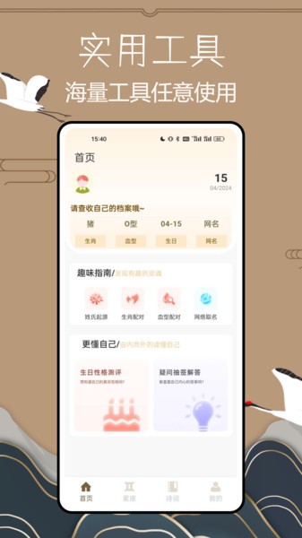 这款卜卜排盘app真的挺有意思的,功能挺多的。首先,它不只是一个普通的运势测试软件,还能查星座、算八字、配对生肖什么的,感觉像一个综合的命运分析工具。最让我觉得特别的是它的诗词页面,每天都有新的诗词可以看,还能了解成语典故,这对于喜欢中华文化的人来说是个不错的选择。