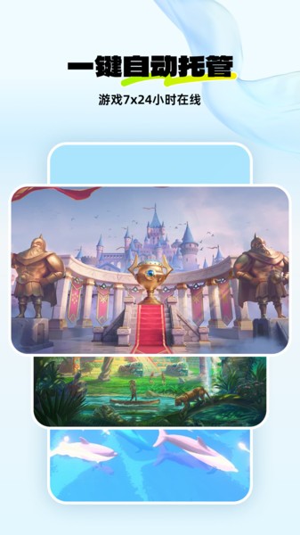 已适配市场上99%手游,让手机变身持续在线游戏手机,0流量0耗电,不怕断网、不怕关机、不占本地存储空间,让手机运行更顺畅。关机断网也能玩手游。