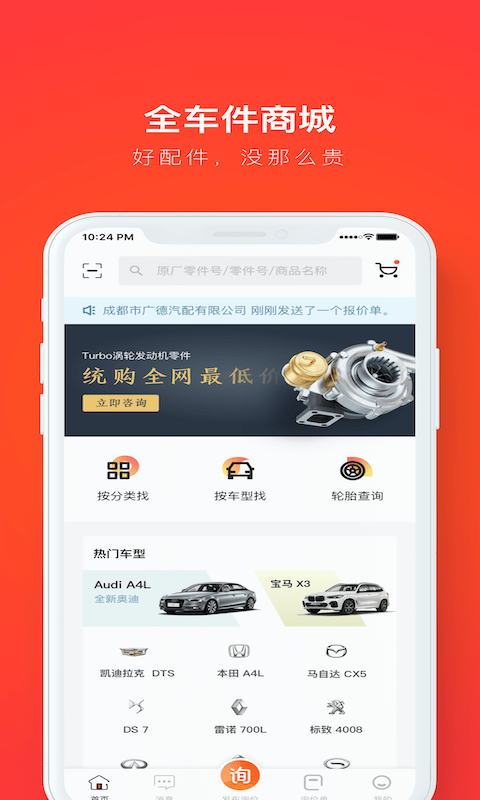 一站式全车件交易平台。平安创配app手机版可以查询用户所需的汽车零部件,商家秒报询价,支持快捷企业支付,汽配采购方便。