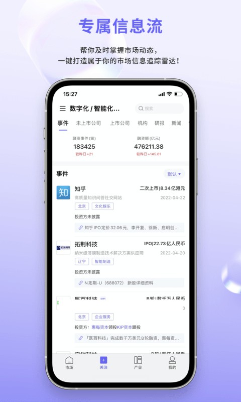 3、关注:按产业或行业,一键式定制专属信息流;
