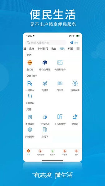 6.便民服务:提供政务服务查询、网上审批、公交查询、生活缴费、火车票与汽车票购买。