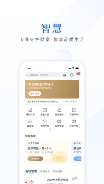 江苏银行手机银行app为用户带来更加使用的金融服务,软件为用户带来更加方便的移动功能,让用户随时总览自己的财富,每一笔消费和转账都更加清楚,还有非常多的理财产品帮助用户增值自己的财富。